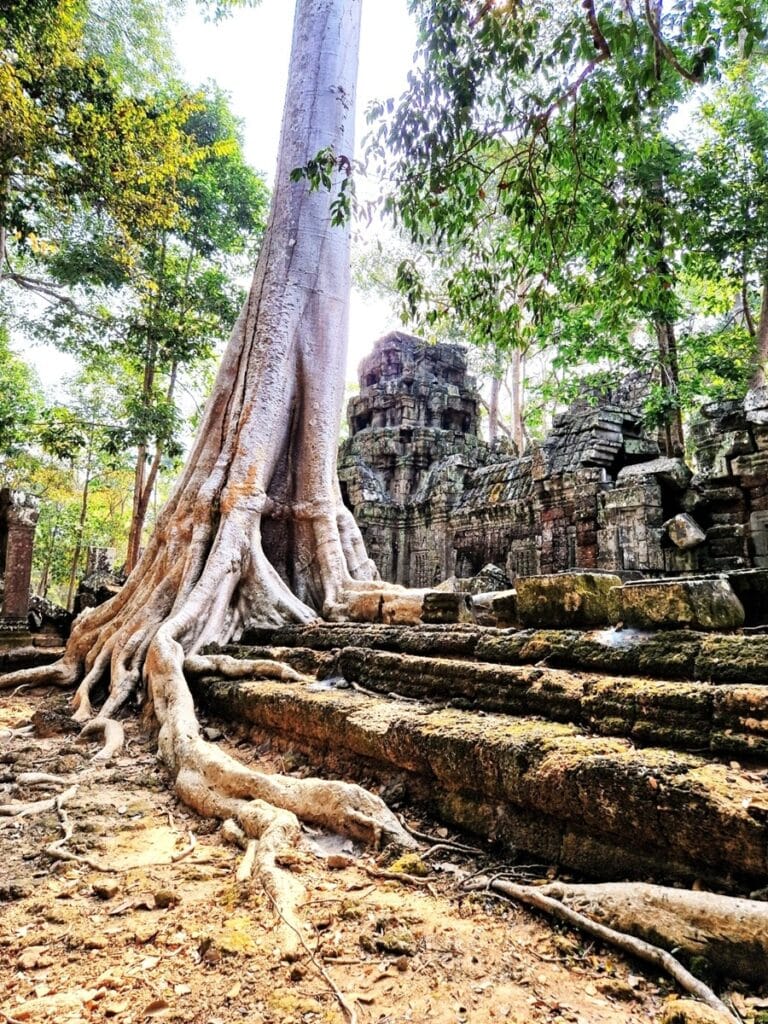Seuraavana aamuna suuntasimme Ta Prohmiin, yhteen Angkorin tunnetuimmista ja samalla salaperäisimmistä temppeleistä. Täällä luonto ja kivi elävät rinnakkain: valtavat puut ovat kasvaneet suoraan temppelien seinien ja kattojen läpi, kietoutuneet pylväisiin ja halkeamiin kuin hidastettu tanssi, joka on jatkunut satoja vuosia.